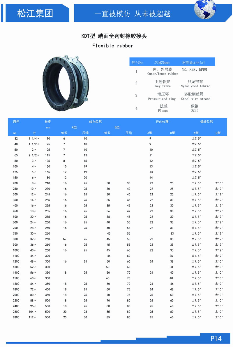 以下是KDT型端面全密封橡膠接頭型號(hào)表: