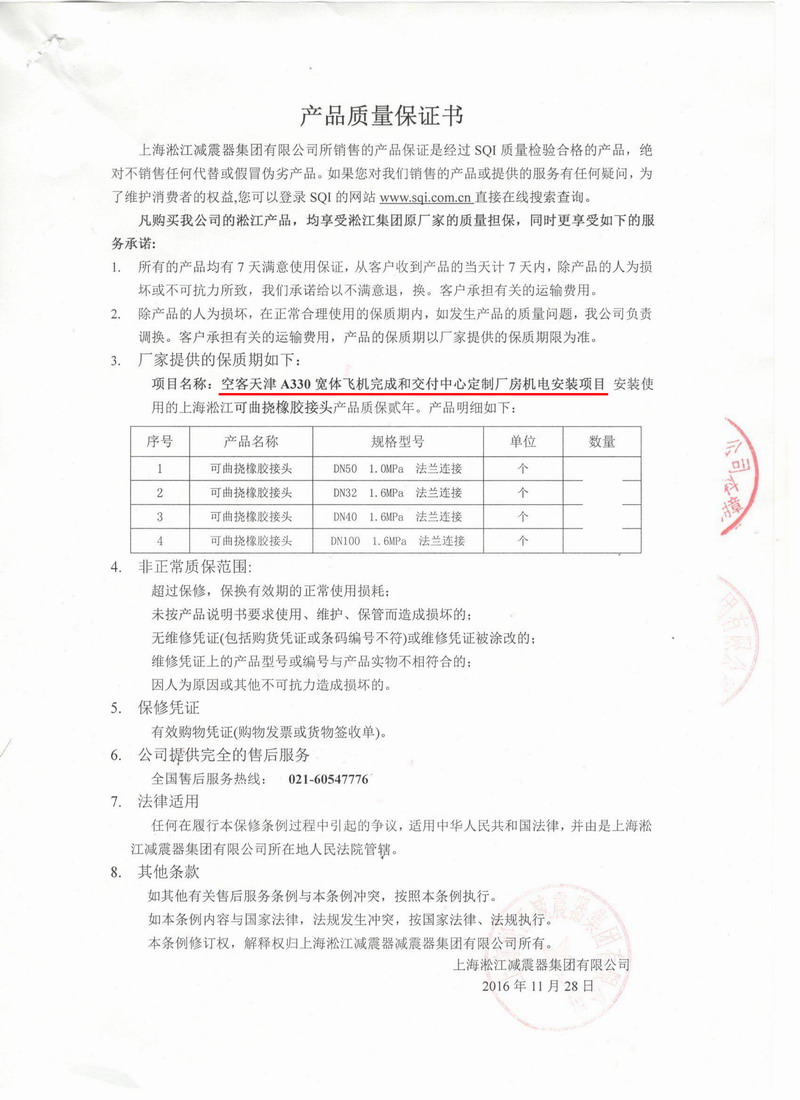 上海淞江減震器集團有限公司官方網站為您介紹:【空客天津A330寬體飛機廠房項目】熱水用橡膠接頭信息,2016年11月25日,淞江集團成功中標空客天津A330寬體飛機完成和交付中心定制廠房機電安裝項目熱水橡膠接頭產品,該項目的安裝是由天津安裝工程有限公司承擔安裝作業。